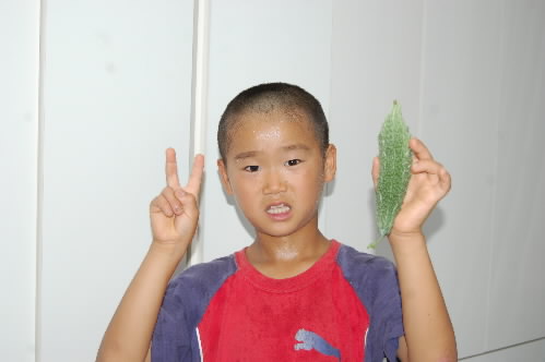 ▲食べ物つながりで、この写真も入れちゃお! これはウチの裏庭でできたゴーヤです(#^.^#) で、なぜ、小僧が濡れているかというと(;^_^A 雨が降ってるときに取ってきたからですっっ ゴーヤを取るのに汗だくになったワケではありませんっっ(^。^;) 小僧は「ゴーヤはニガいから嫌い」と言いながらも、自分で育てたゴーヤは懸命に食べてました(^o^)