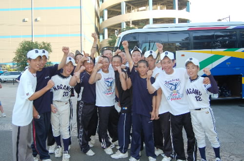 3日前までシニアの全国大会で東京にいた大正シニア。決勝は青葉緑東シニアに16対0の大敗でしたが、あっという間に切り替えたようでf^_^; 決勝翌日はディズニーランドにいって1日思いっ切り遊んで、翌11日(昨日)大阪に帰って、そして今日12日の朝大阪を出てきたという強行日程(^。^;) みんなが自宅に戻れたのはたった1日だけ? でも、タフな彼ら、疲れもみせずに元気に戦うことでしょう!