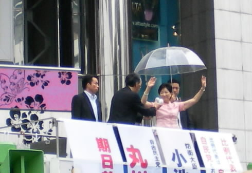 ▲何かと思ったら、ちょうど小池百合子防衛大臣が選挙カーにあがったところでしたっっ! 丸川珠代候補者の応援演説ですねっ