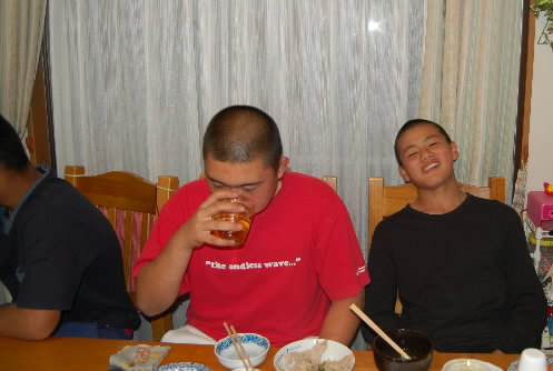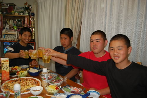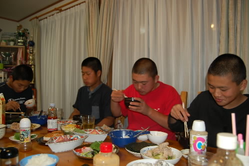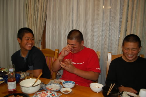 ▲「腹がこんなに出ちゃった~(>_<")」と田島くん&代田くん、そうぉぉ?? まだまだいけるんちゃう??(^^;;) なぁんてっっ 一番右の大島くんは、「こんなに食べたことないです~(>_<")」 でも、こうやって胃を大きくして食べられる体を作らないとね(^_-)-☆