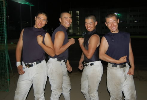 ▲左から、世田谷西シニア卒の篠崎正貴くん、富士見シニア卒の長瀬舟くん、杉並シニア卒の矢島隆弘くん、江戸川北シニア卒の米持優一くん! 鍛え上げたボディーで、ハイチーズ(≧▽≦)♪♪