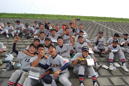 ▲逆転勝ちに沸く東京和泉ナイン! 勝つと弁当がますますウマイ!