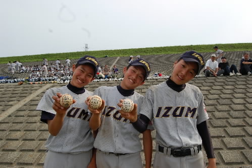 ▲東京和泉シニア、ホームランを打った3人(左から鋤田涼くん、佐尾翔舞くん、木南了くん)の写真を撮ろうと思ったら、なんだかカタイカタイ! 後ろの方で、ちっちゃな男の子(誰かの弟くん?)が「こうやるんだよぉぉ(o^-^o)」と手本を見せてくれまして・・・。で、右の写真はそれに倣って撮った写真です~(*^-^*) ちょっと恥ずかしぃ??(*´艸`) いえいえ、いい笑顔です!!