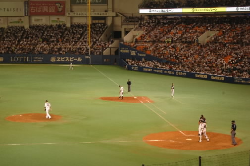 試合はロッテが3対0で勝っていましたが、7回にソフトバンクの多村選手が同点3ラン!(この一打の瞬間を、リュウオウは持参したカメラでばっちり撮っていた! ナイス!! カメラマンになれるっ!) 7回裏、ロッテは井口選手のタイムリーで勝ち越しましたが……