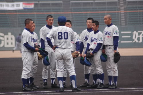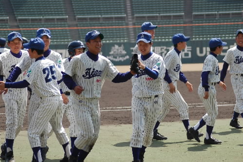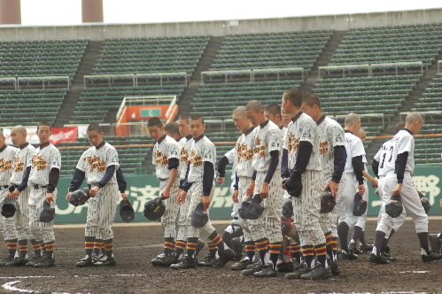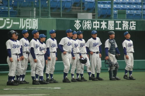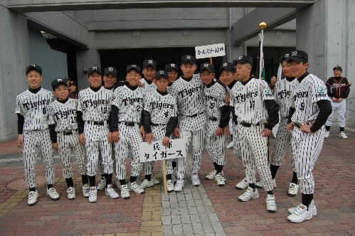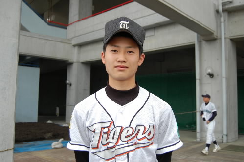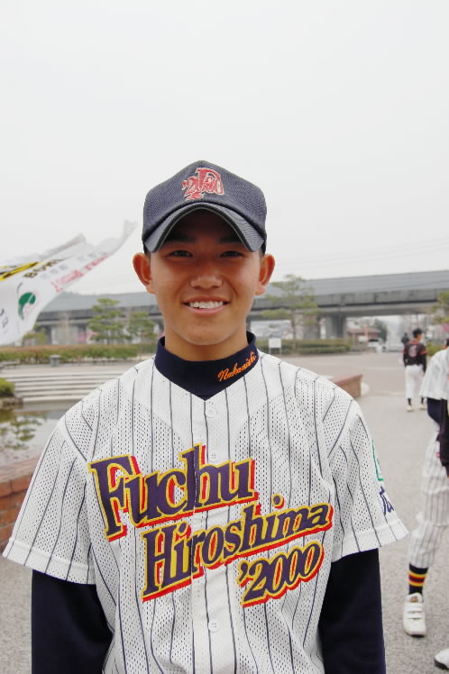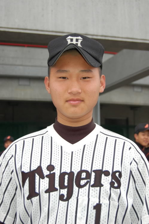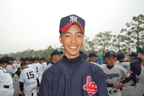 ▲こちらチームの中心・松倉昂輝くん。4番でエース。182センチ、86キロ MAX130キロ近いストレートを持つ怪腕です。冬の走り込みが効いてか、この大会が始まる前まで失点なし! 打つ方でもあたっていてホームラン4本。「目標の選手は?」の選手に、みんなが「朝青龍!!」 あら、相撲部屋?かと思ったら本人、タイガースの金本選手だって! プロになって今と同じ縦縞のユニフォームをきて、甲子園で活躍することが目標だそうです!