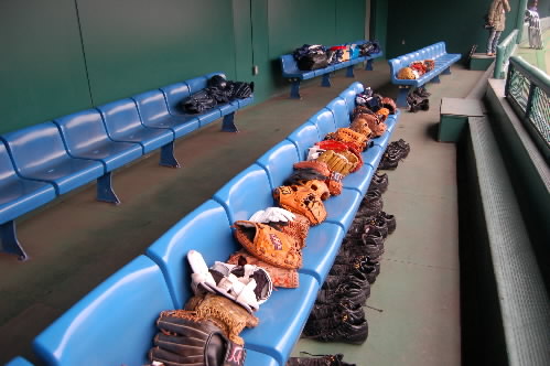 ▲開会式中、目についたのが、三塁側のベンチキレイに並べられたグラブとスパイク。オール岡山チームです。いやぁ、きちんとしてるな~と感動ですっっ