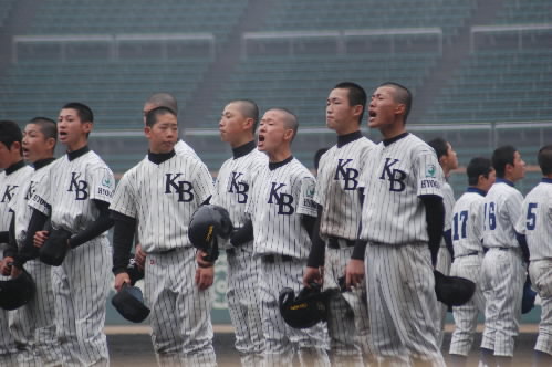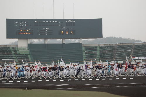 3月24日 岡山県倉敷市 倉敷マスカット球場 朝8時! 小雨の中、ヤングリーグ全国大会の開会式を待つ選手たち・・・・。