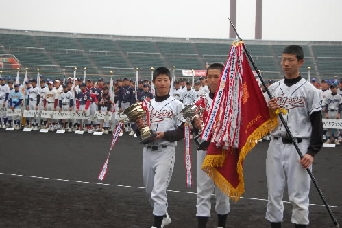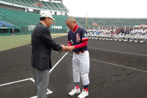 ▲入場行進が最も素晴らしかったチームに送られる「行進賞」 中学生の部は「ファイターズ岡山」が受賞し、キャプテンの吉國公隆くんが記念品を受け取りました! ヤング屈指のベテラン・長谷川寛監督率いるファイターズ岡山は野球も強いですけど、礼儀正しくて、自分たちのこともちゃんと自分たちでできるチームです。清々しさが感じられます(^_^)