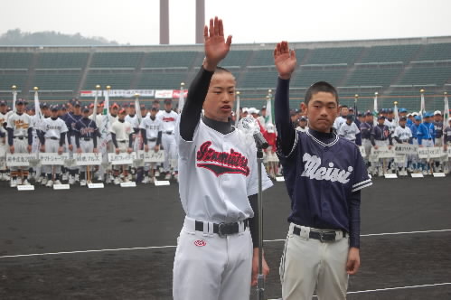▲選手宣誓は小学生の部は明石明星の徳田義満くん、中学生の部は泉大津ヤングの荒木良介くん。元気いっぱいの宣誓でした(^_^)