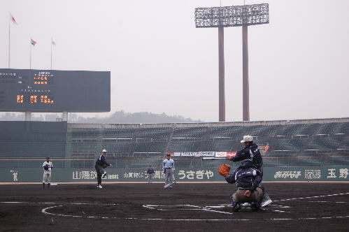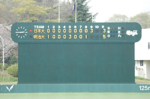 ▲明大ベンチには川口監督さんはいらっしゃらない様子。別府総監督にお聞きしたら、今日は入学式で監督はいらっしゃらないとのこと。試合後は5対0で明大リードで迎えた最終回、日大が3点返してなおもチャンスが続いたのですが、明大の久米投手が踏ん張って5対3で逃げ切り勝ちでした。