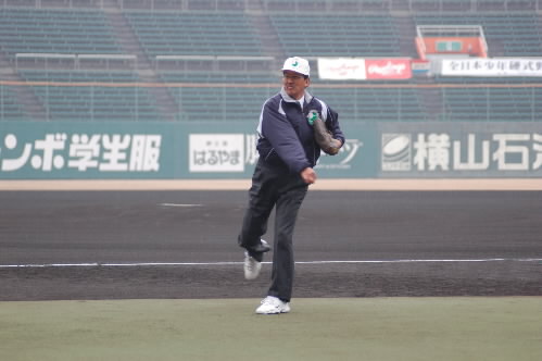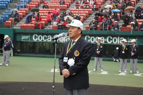 ▲ヤングリーグの山本一義会長。広島商~法政大~広島で活躍。引退後は広島の打撃コーチなどの後、ロッテの監督も務められた方。すっごい方なのに、とっても気さくで話しやすくて、私ごときにも毎回いろいろな話をしてくださるし、バッティングの講義もしてくださいます。「会長」なのに、本部席にじっと座ってるわけでもなく、各球場を回って試合をみては選手たちにも積極的に話しかけて励ましてくれています。開会式では「全力疾走」「全力プレー」「最後まであきらめない」ということを選手たちに伝えておられました!