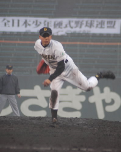▲準々決勝でノーヒットノーランを達成した大家淳徳(あつのり)くんです。球に切れがあります! 初回、先頭バッターに四球を与えて以降、塁を許さず最終回へ・・・そこまで三振は11個! 2回から3回にかけては5者連続三振! 一人セカンドゴロをはさんで、また2者連続三振っっ 圧巻でした!