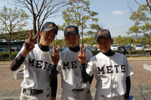 ▲こちらは準優勝の岡山メッツ、左から主砲・古河真悟くん、キャプテンの藤井翔悟くん、160センチ、52キロの小さな大エース丹波将之くん! 優勝はできなかったけど、力は互角! 大健闘でした!