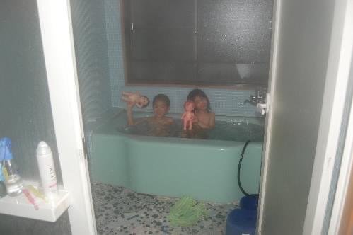▲子連れのときはホテルよりも旅館を選んで泊まります~ここも3人泊まって6000円くらいと超安いっ 建物は古いけど、12畳くらいあって広いし、お風呂もゆったり入れて満足っす! 小僧&女神は、いつものことながら大はしゃぎっっ お風呂も、連れてきた、ぽぽちゃん、メルちゃんと一緒に入ってました~