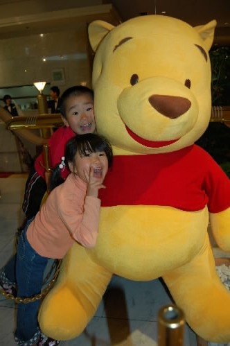▲宿泊先のホテルのロビーにてっっ 大きなクマのプーさんがおいてあるのですが、子どもたち大好き(^_-)-☆ このホテルには毎年のように泊まっているので、プーさんに会えることを楽しみにしていた女神であります(*^-^*)