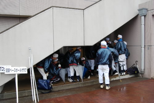 ▲開会式できんのかなー、できないのかなー、階段の下で雨宿りする選手たちっっ