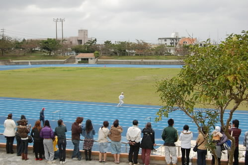 カメラマンがいっぱいいるところがハンカチ佑ちゃんがいるところ~(#^.^#) すぐに分かりましたっっ ちょうど球場から隣りの陸上競技場に移動しているところで、カメラマンがゾロゾロ。トラックをグルグル何周も走っていました~。佑ちゃん、メッチャ小さい! 公称173センチでしたっけ、それ、あるの??って感じるくらい小さく見えますね(^_^;