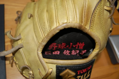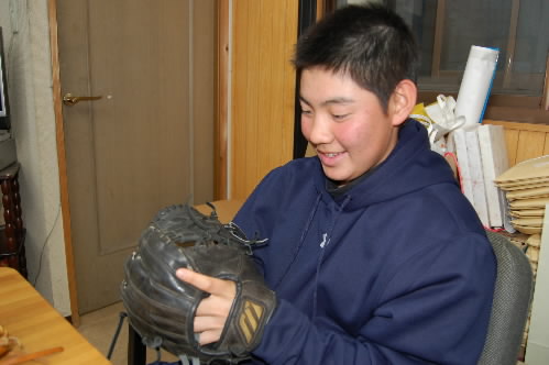 ▲宝物のグローブをみつめるユッコ、一緒に寝ているそうです!