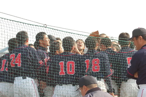 ▲初戦で5点差を最終回にひっくり返して奇跡の逆転勝ちをした目黒西シニア。今週も、6回に逆転されましたがその裏、同点に追いつき、7回裏、写真のようにベンチ前で気合いを入れて臨んだ7回裏・・・・