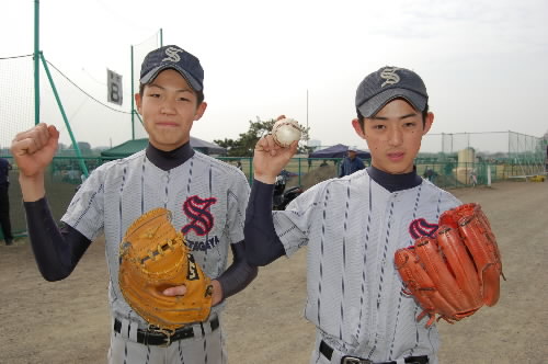 ▲東京日暮里戦でノーヒットノーランを達成した能登谷貴仁くん(172、60、右右)とキャッチャーの須藤滉大くん(175、64、右右) 能登谷くんが好投手なのは言うまでもありませんが、キャッチャーの須藤くんも将来有望ですよっ 毎日素振りを欠かさない努力家でもあり、通算5割近い打率を残しています!!
