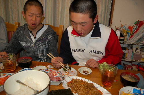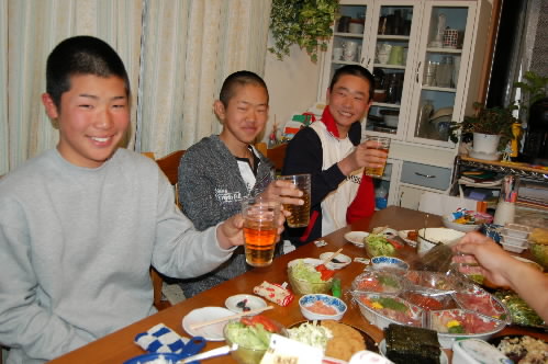 で、昨晩のお泊まり会、石田くん、谷岡くん、外山くんの3人がきたのですが、夕飯に手巻き寿司を用意し、さて「いっただきま~す!!」と言ったものの、みんな、なかなか食べ始めないっっ 緊張してるのかな?? 「ほら、遠慮しないで食べなよ!!」って促すと、目の前のノリやらネタやらを目の前にして、「これ、どうやって食べるんですか??」と言うのですよ~。