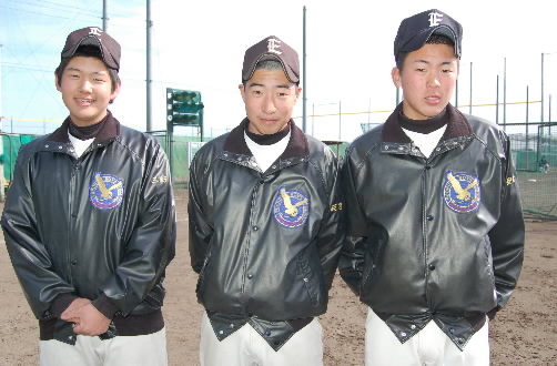 ▲こちらが今チームの特に注目3選手!! 左から三好尚輝くん(4番ファースト)、安斎良馬くん(投手)、飯沼穂高くん(3番サード・ショートでキャプテン)