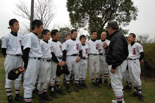 ▲試合前になるとさすがに顔がピシっと引き締まります! 右は遠藤忠監督。高校野球の審判もされています。高校野球をふだんから見ていることもあって、シニアの指導の中にも「高校につながる野球」がみえます。