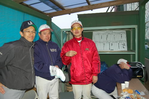 ▲左から、T銀行OBの堀野さん、調布シニア所属の審判さんです、通称=ボブ!(o^-’)b 中央がD総研?D証券?の渡辺コーチ、通称=ジョン!(*≧∇≦) 右は、こう見えても・・・といったら大変失礼ですがっ(*^。^*)もとプロ野球選手!! 調布シニア→早実→ドラフト6位で巨人入り→3年後に引退し、現在は家業を継ぎながら、調布シニアのコーチをしています。通称=シャンフーエン!(中国名! って、中国人なワケじゃありませんっ よく中国人に間違えられるそうで(;^_^A