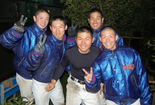 ▲上の写真じゃかわいそうなんで、ネット裏横に移動! 今度はちゃんと撮れてますね(^O^)/ 右から蜂谷大棋くん、後ろにいってエースの大田阿斗里くん、前に戻って中村晃くん、センターの本間弘士くん、小谷野翼くんです!