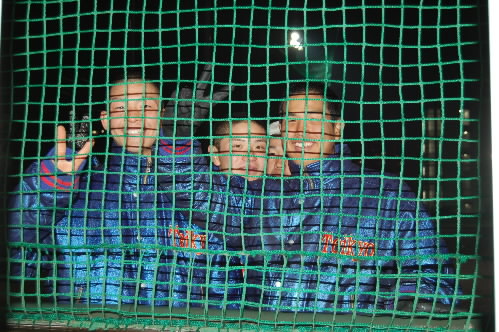 ▲で、ネット裏の部屋で取材をしていたら、その目の前を、自主練を終えた選手たちがウロウロっo(^ヮ^)o こちらからカメラを向けるとピースサインっ 網でよく顔が見えないですけど、左から蜂谷くん、小谷野くん、先日も取材した大田くん! その後ろに見えるのは誰だ~??