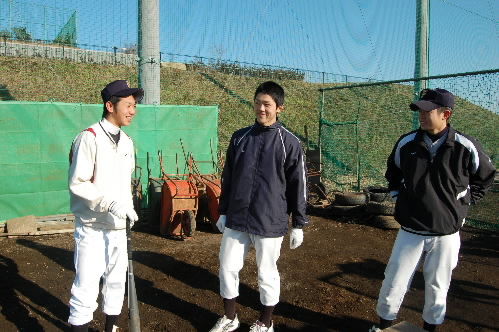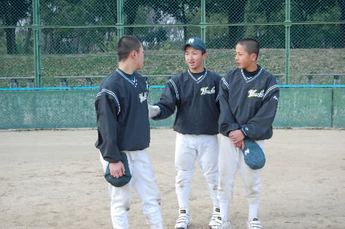 ▲高校受験を間近に、高校入学を3ヵ月後に控えた中学3年生選手たちも来てました(^_^) 左から相羽将一くん(静岡県の某私立高校進学希望!)、中央がエースだった上田大輔くん(都内の某超強豪私立高校進学希望!)、左が丹生健人くん(都内の某頭のいい私立高校進学希望!(^O^)) 初日から練習に来るなんて、なかなか気合いを入ってますね! エライ!!