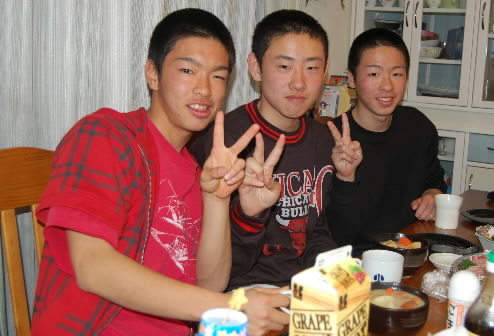 ▲食後はママ記者の仕事部屋にきて野球雑誌をペラペラと。中原くんが読んでるのは「中学野球小僧」かな? 野球本がい~っぱいあるので…(25年前ぐらいからの高校野球雑誌、ほとんどそろってます(^_^; 下手したら、みんなのお父さんが甲子園に出てるころの雑誌もあるかもよぉっっ) なので、みんなこの部屋に来ると目を輝かせます(*≧∇≦) 以前来た安丸くんは「ここにずっといたい!ここに住みたい」なんて言ってたくらい(^_^; 某有名高校のユニフォームやら、プロ野球選手(松坂、涌井、岩隈ほか!)や高校で活躍する選手(中田翔ほか)の中学時代の写真など、レアグッツもあるので、楽しいようですね(^_^)