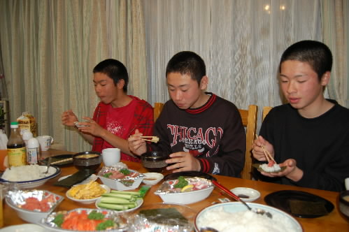 今日は我が家で10年以上続く選手お泊まり会! 今年最初は、中原くん、木下くん、小坂くんの3人です(^_^) 今日は、私が携帯ショップに行ったりで作る時間もなかったので、監督自らチャカチャカ準備をして、手巻き寿司をしました~(*^。^*)