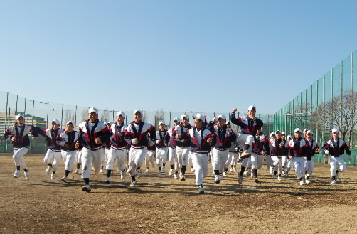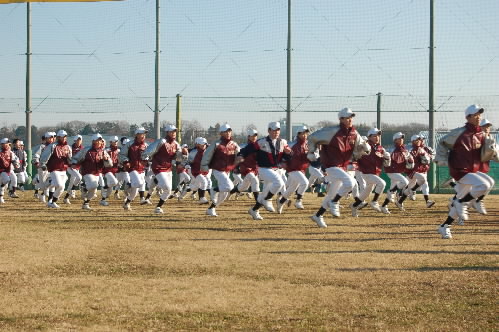 ▲まずはランニング! 人数多いですけど、足並みそろっていて気持ちいいですねー。上は2年生、下は下級生。「ランニングの下手なチームに強いチームはない! ランニングがうまいチームに弱いチームはない!まずはランニングから!」という監督のもと、そうとう「ランニングの練習」していますっっ ちなみに、武蔵府中シニアは行進もすごくウマイです。