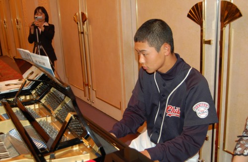 そして、会場をあっと言わせたのが、2年生の森山雄一郎くん!♪ポロロロ~ンっと、綺麗なメロディが流れてきたので前方をみたら、なんと、ユニフォームをきた選手くんがピアノを弾いているではありませんか~!! それも、私が大好きな曲、「栄光の架け橋」です(≧▽≦)♪♪