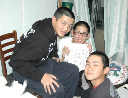で、お風呂あがるともう頑固オヤジと女神ちゃまはすでに寝ていて、小僧の足裏マッサージ→就寝後、2階にあがって、選手くん3人と軽くおしゃべりタイムっ 今日はウチの近くの信保ソウタくんと下豊留ジュンくんと杉本コーキくんの3人!